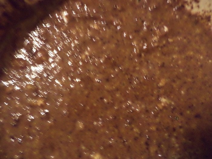 Соединить орехи, шоколад, сахар, перемешать, добавить яйца и фруктовый сироп, тщательно перемешать.