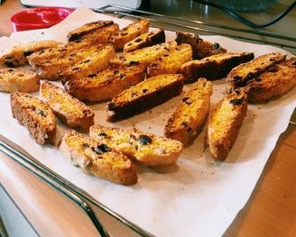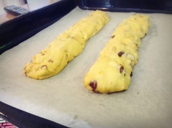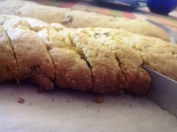 Остужаем как обычно, чтобы не увлажнилось дно, на решетке минут десять. Разрезаем наискосок на продолговатые печеньки толщиной примерно в палец.