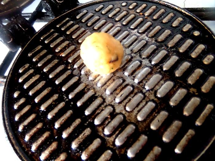 Теперь ставим вафельницу на огонь и разогреваем её с обеих сторон. Затем смажем кисточкой поверхности и кладём шарик в центр.