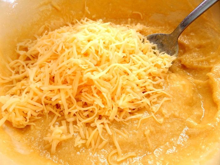 Высыпаем тёртый сыр,перемешиваем.