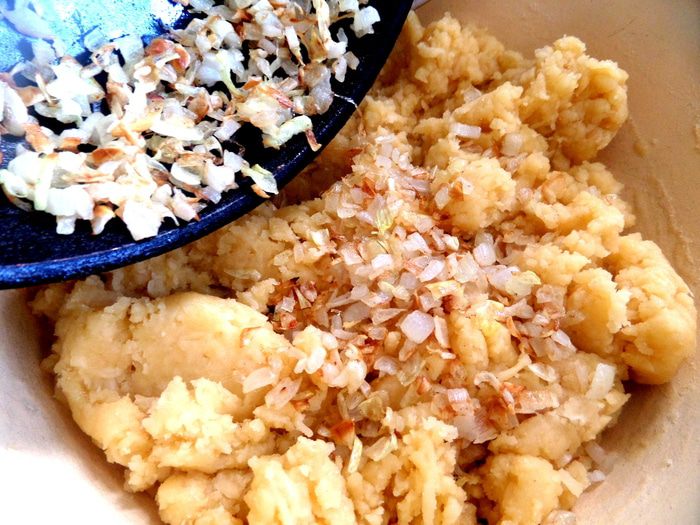 Масло немного остудить и всыпать по частям муку. Муки возьмёт может и больше,тут зависит от плавкости сыра и сочности лука,раз уж мы его добавили)))