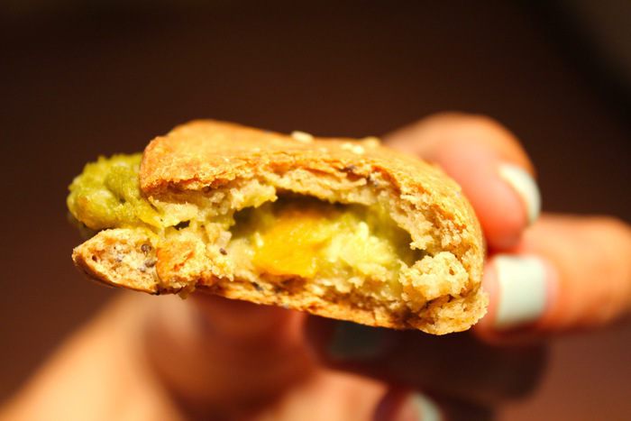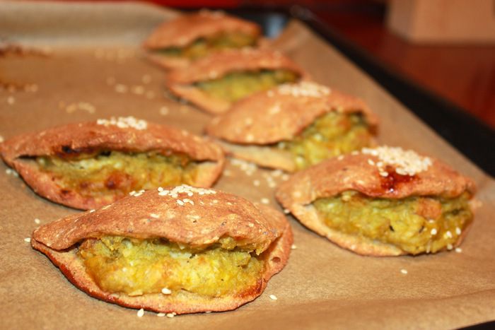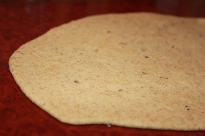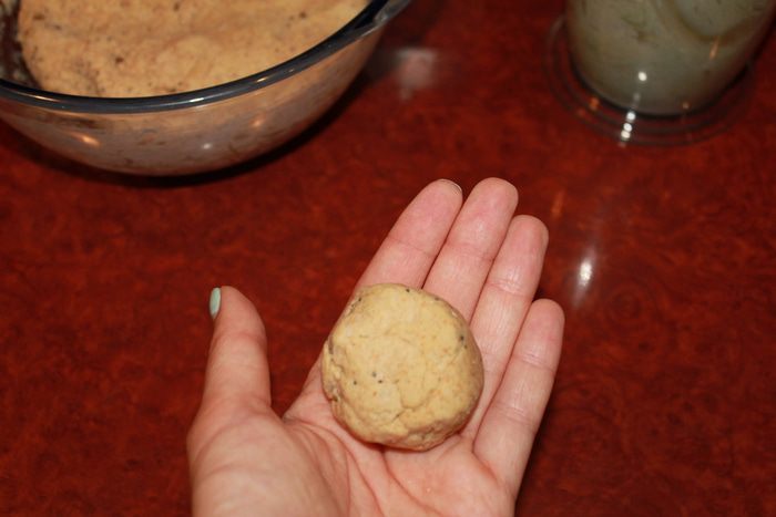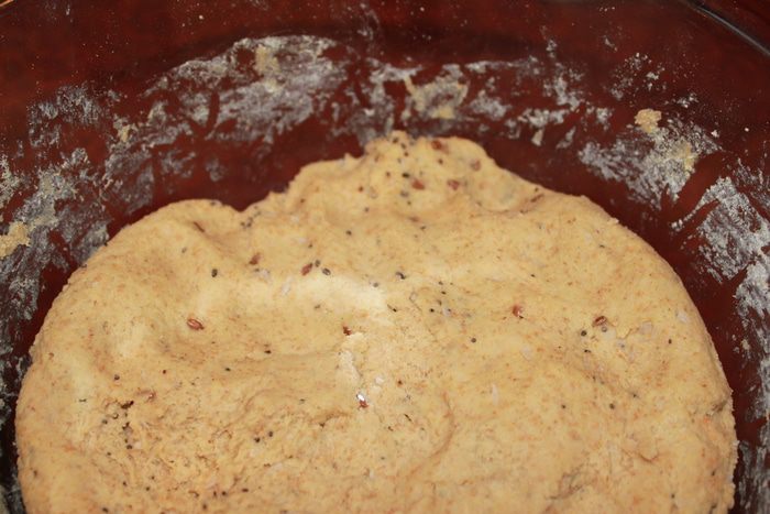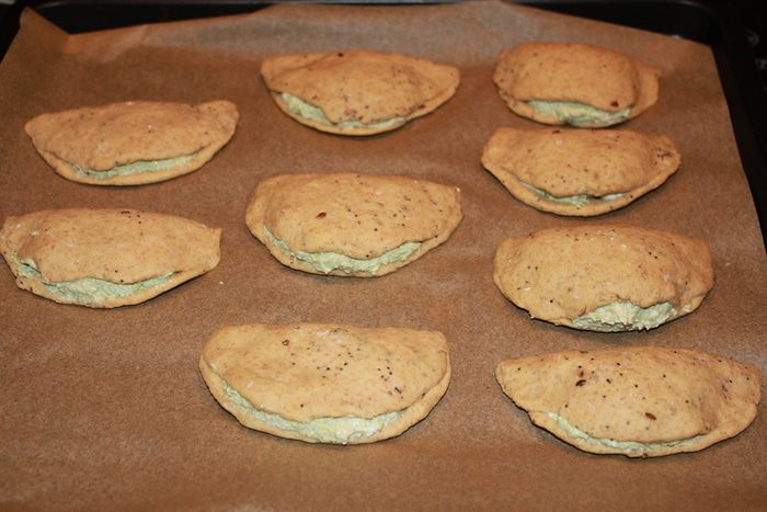 3/4 банана взбить блендером с яйцом, добавить кефир, затем соду и муку. Вымесить тесто. Добавить семена и ещё раз хорошенько вымесить. Получается достаточно тугое, к рукам практически не липнет. Отставляем тесто на время приготовления начинки, накрыв пленкой.
