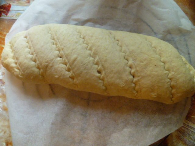 Перенести на противень с пергаментом, сделать насечки поглубже.