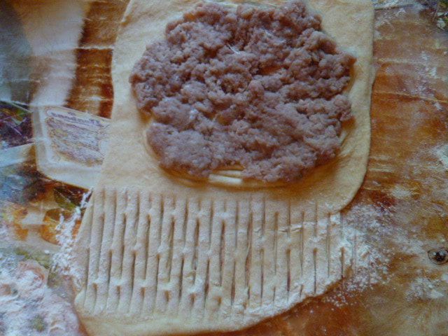 На одну часть теста выложить фарш, вторую часть прошла роликом для теста.