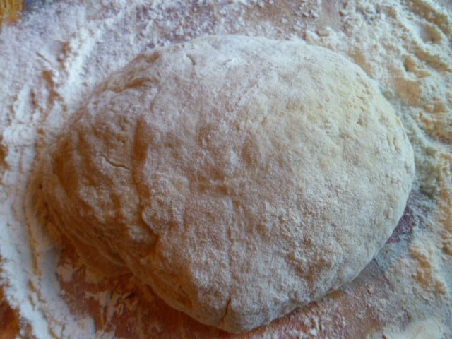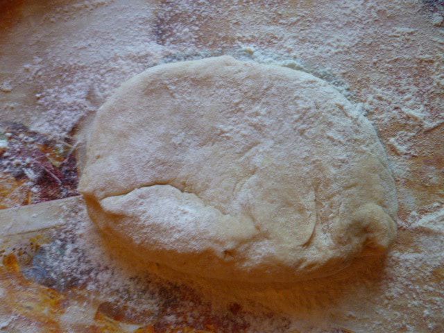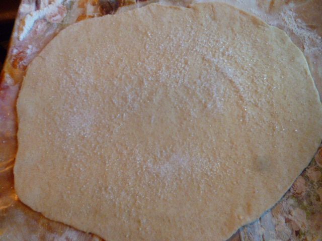 Раскатываем часть теста тонко на столе посыпанным мукой.