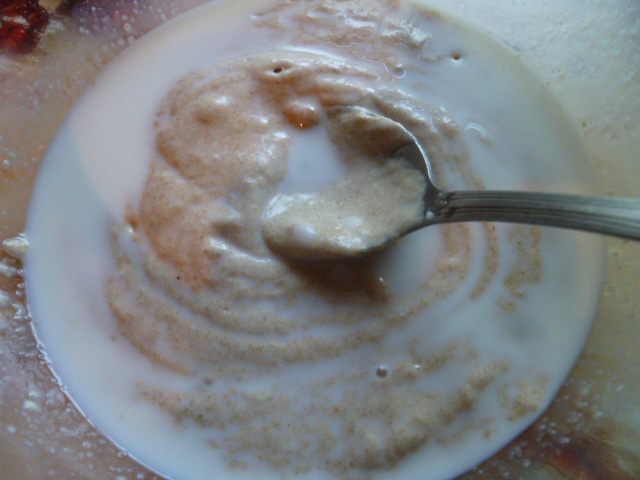Влить 100 мл молока, добавить щепотку соли, 1 ст.л. сахара и хорошо перемешать.
