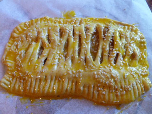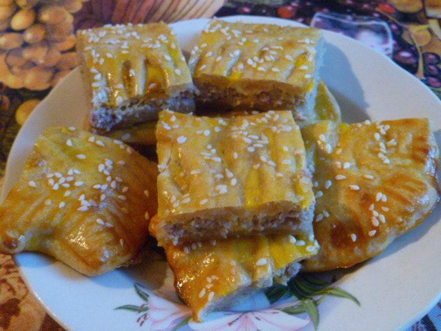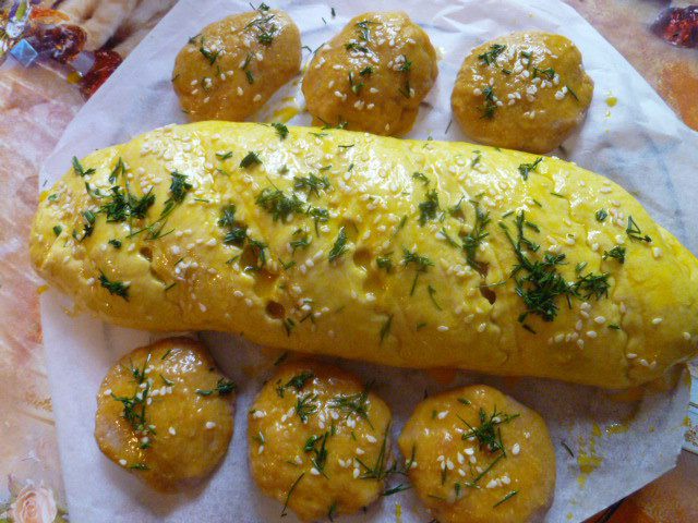 Переносим на противень с пергаментом, обильно смазываем взбитым желтком с 1 ст.л. молока. В дырочки выливаем остаток и сверху посыпаем кунжутом.
