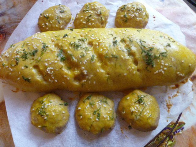 У меня осталось немного фарша на котлетки. Их я тоже смазала и посыпала.