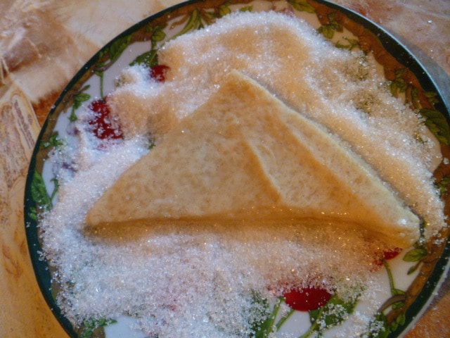 Сложить вдвое. Тонко раскатать, посыпать сахаром, сложить, раскатать.
