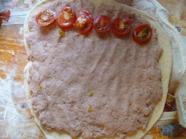 На тонко раскатанное тесто выложить тонким слоем фарш. На один край выложить порезанный помидор.