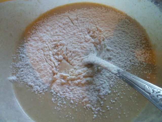 Аккуратно ввести просеянную муку с содой( на кончике ножа).