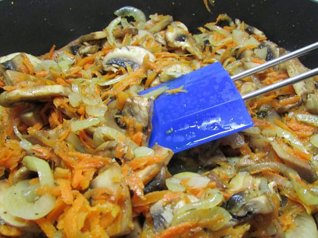 Лук припустить на растительном масле 2 минуты. Добавить к нему морковь и грибы, хорошо перемешать. Затем добавить соевый соус и сухие специи.