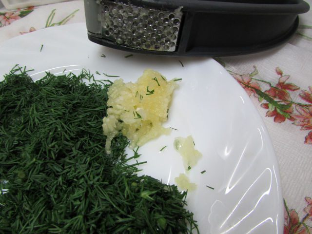Мелко нарезать зелень, через пресс выдавить чеснок.