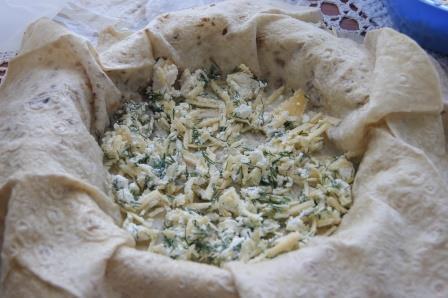 На дно формы с лавашами выложить 1/3 начинки, смазать заливкой, 2 конца верхнего лаваша завернуть внутрь, смазать заливкой.