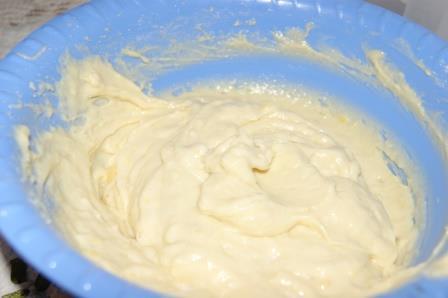 Продолжая взбивать по одному добавить яйца. Добавить просеянную с солью и разрыхлителем муку и смесь йогурта и персикового пюре.