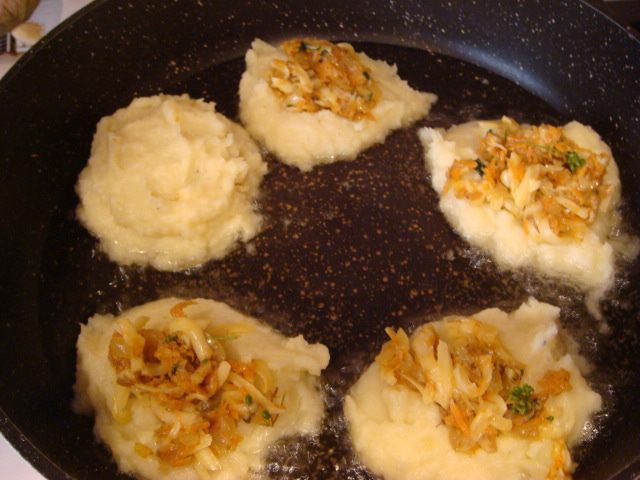 Отварить картофель (у меня 5 крупных) слить воду, пюрировать толкушкой, оставить остывать.
