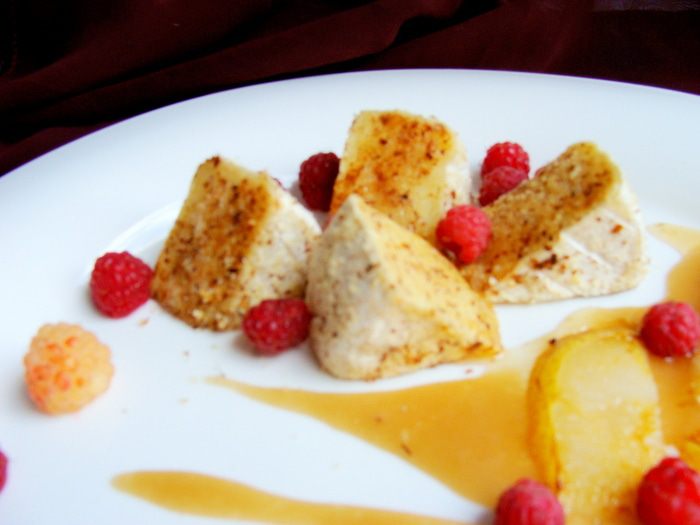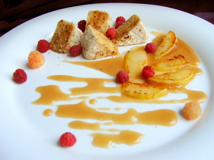 Первый раз, я поробовала это блюдо в кофейне. Мне принесли его со свежей грушей и черешней вместо малины. Это было первое впечатление и сравнить мне было не с чем... Я была просто в вострге! Смаковала все это великолепие и запивала горячим кофе! Через несколько дней вернулась, пришла специально длятого, чтобы повторить удовольствие и возобновить ощущения)) В тот день был уже другой повар по всей вероятности, т.к. мне принесли практически другое блюдо! Груша была порезана кубиками и обжарена, а вместо черешни, была клубника. Если то, что груша оказалась горячей, мне очень понравилось и гораздо больше предыдущего варианта, то клубника тут совсем бла не к месту... черешня тоже, если честно, но первый раз я не поняла этого)