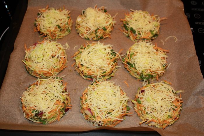 Разогреть духовку на 180 градусов. С помощью кондитерского кольца сформировать оладушки на пергаменте. Сверху выложить натёрный сыр.