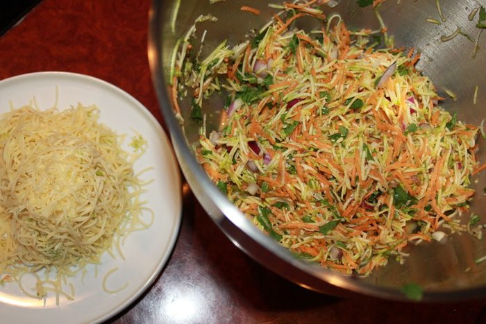 Натереть на тёрке кабачок среднего размера, морковь, сыр. Луковицу и зелень мекло порезать. Если образовась жидкость от кабачка, слить. Не солить, сыр восполнит вкус. Добавить яйца и Ваши любимые специи, всё перемешать.