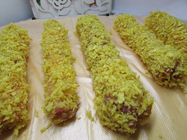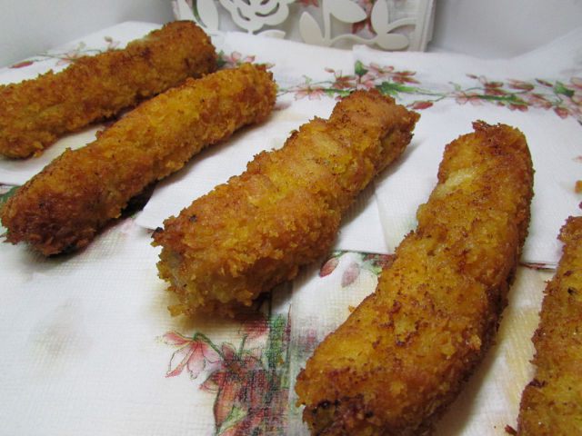 Обжарить на слабом огне, в масле со всех сторон. Огонь должен быть действительно слабый, иначе наггетсы сверху подгорят, а внутри останутся сырыми. Выложить на бумажное полотенце, чтобы ушел лишний жир. К этим наггетсам хорошо подходит соус: