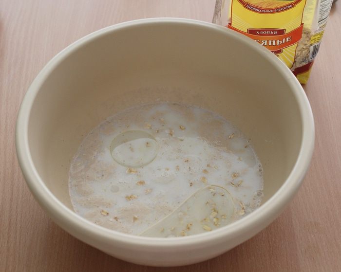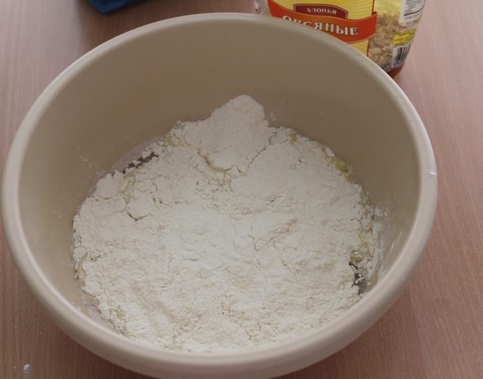 Теперь добавляем в нее муку, сахар, овсяные хлопья ТМ «Националь».