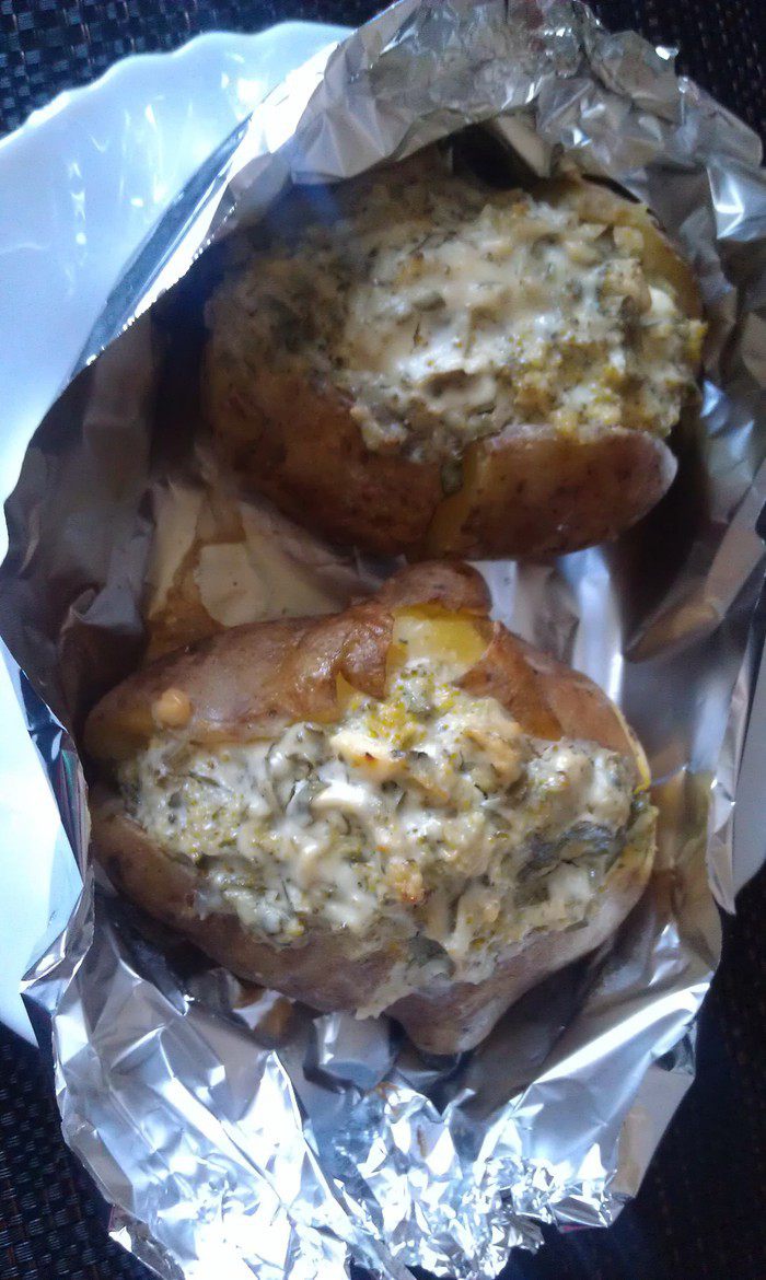 Из фольги вырезать прямоугольники и сделать порционные лодочки, защипнув края с двух сторон. Выложить в каждую по две картофелины, слега их посолить и сбрызнуть оливковым маслом, начинить творожно-овощной смесью. На донышко каждой лодочки налить по ложечке оливкового масла.
