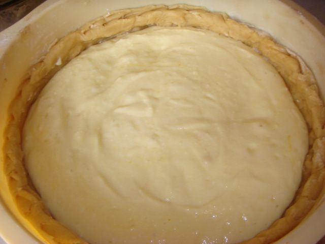 Распределить тесто по форме с бортиками и выложить начинку.