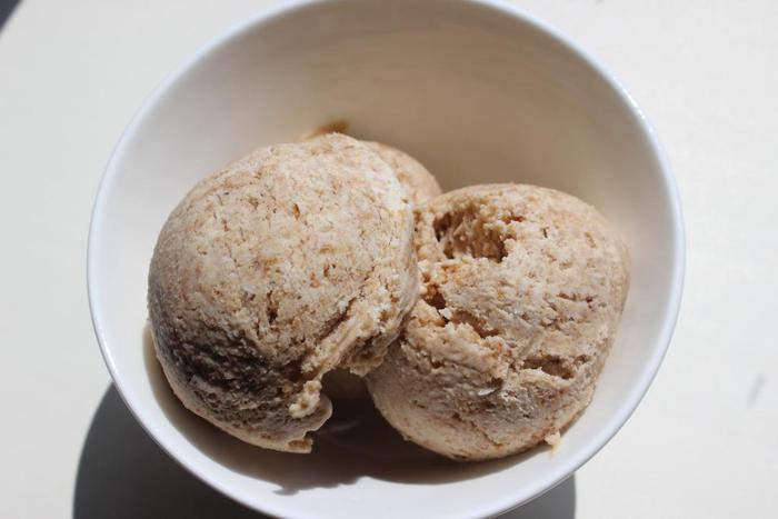 По консистенции оно не совсем как привычное нам мороженое, а немного плотнее, но вкусное......