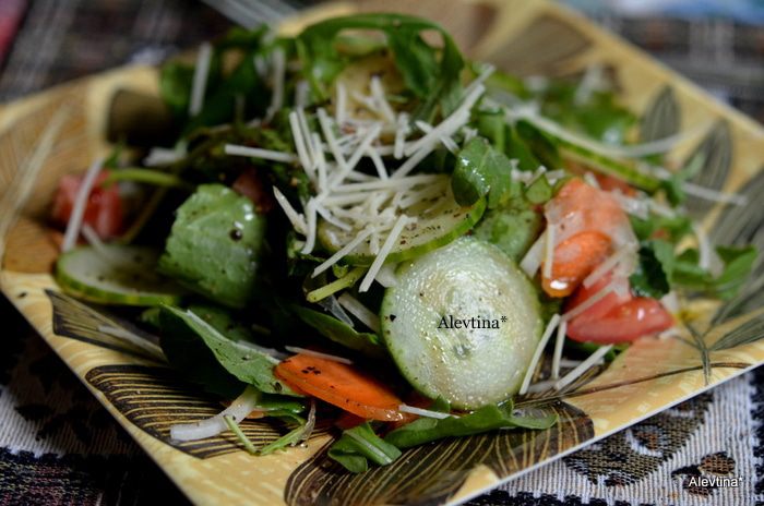 Подаем на стол. Заправляем перед подачей на стол. Посыпать Пармезаном. Приятного аппетита.