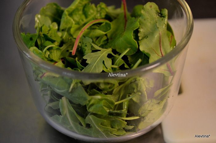 Используем молодые листья шпината или смесь молодых салатных листьев как шпинат, листовая капуста.