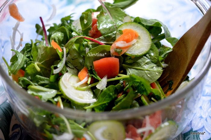 Огурец, помидор,морковь, луковицу порубим тонко в ручную или кухонном комбайне. Смешаем в емкости с листьями салатными.