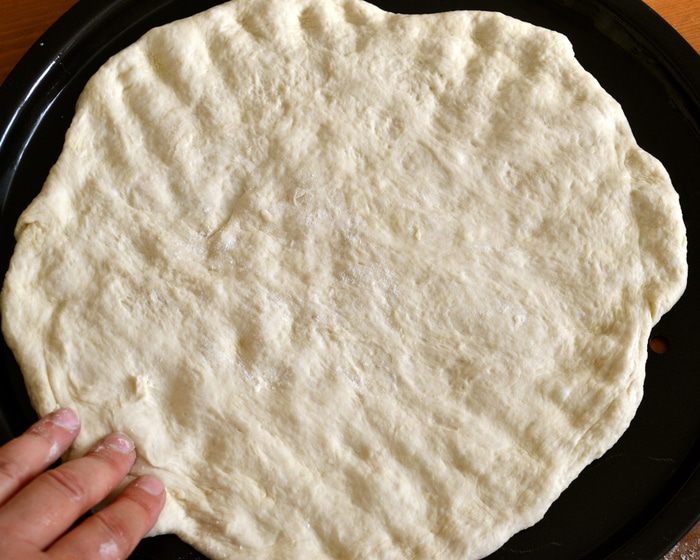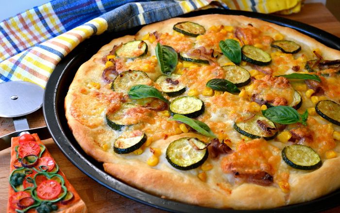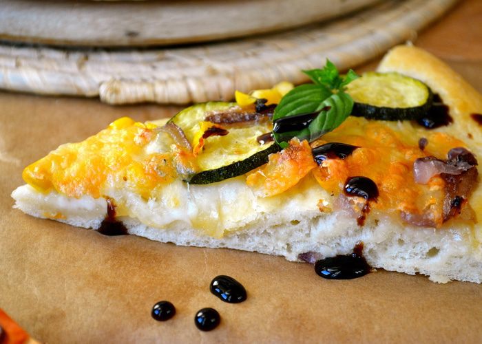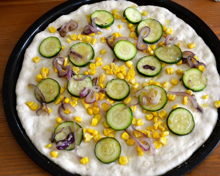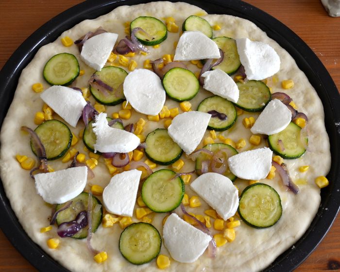 Тем временем для начинки нарезать кольцами лук, и цукини кружочками. В сковороде разогреть 1-2 ст.л. оливкового масла и положить лук, цукини, выдавить туда же 2-3 зубчика чеснока (по вкусу). Время от времени помешивая, дать овощам поджариться 5-6 минут. Они не должны зажариться, просто кабачок должен стать чуть мягче. Посолить и поперчить по вкусу. Выключить огонь и отставить в сторону.