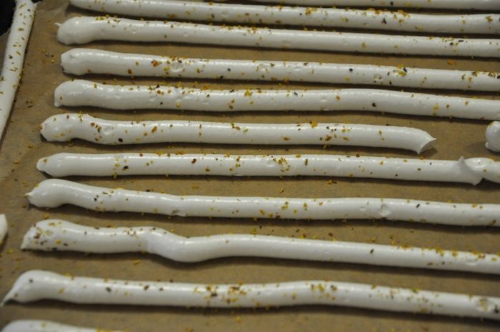С помощью кондитерского мешка отсадить на пергамент безе в виде палочек Посыпать мелко нарубленными фисташками, у меня крошка. И сушить их в духовке при температуре 100 градусов 2-2,5 часа.