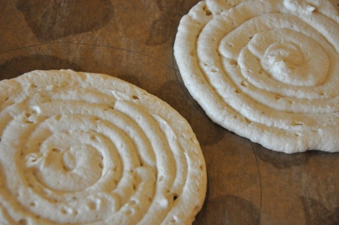 Белки с щепоткой соли и лимонным соком, постепенно добавляя сахар взбить до устойчивых пиков. Перевернув миску, безе не должно падать.