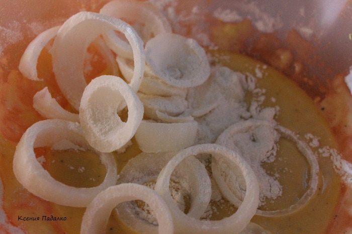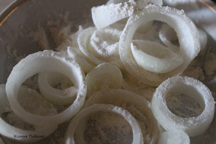 Луковицу нарезать толстыми кольцами, засыпать мукой и перемешать.