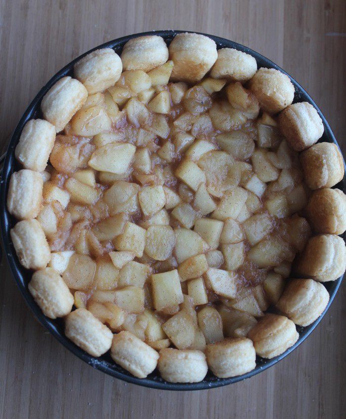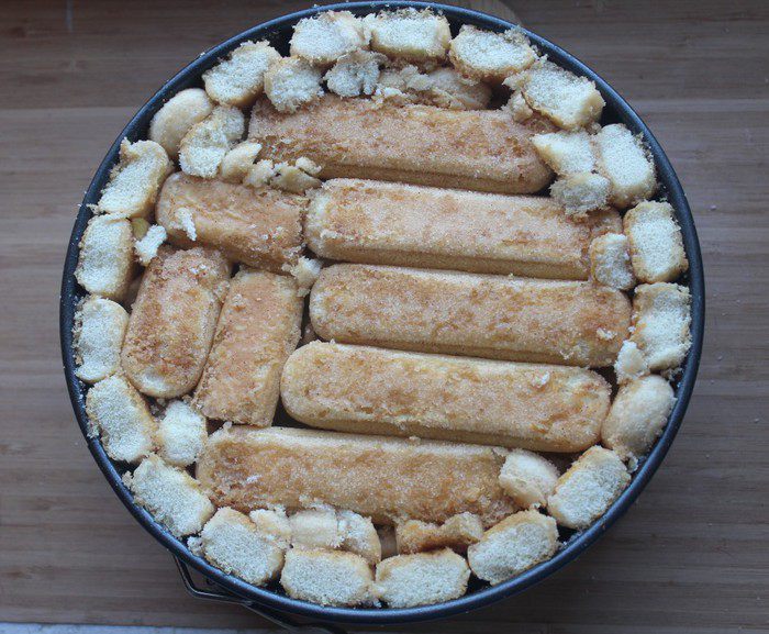 Сверху выкладываем оставшиеся палочки савоярди так же пропитанные сиропом. Отправляем в разогретую духовку на 25-30 минут. Когда верх шарлотки зарумянится, пирог готов. Охладить в форме, перевернуть, посыпать сахарной пудрой и лимонной цедрой (по желанию)