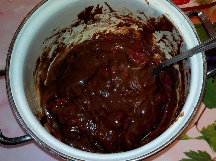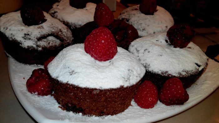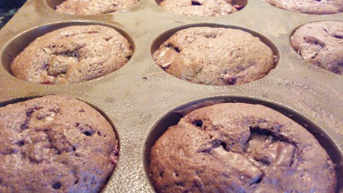 Смешать жидкие ингредиенты с сухими. Добавить половину шоколада и малину, аккуратно перемешать. Разогреть духовку до 180 гр. Разложить по формам (у меня получилось 9 шт, но думаю можно было уместить и в 6) и присыпать оставшимся шоколадом.