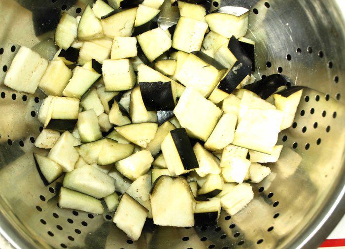 Баклажаны нарезать произвольно, перемешать с солью, оставить на 30 минут, чтобы дать стечь горечи.