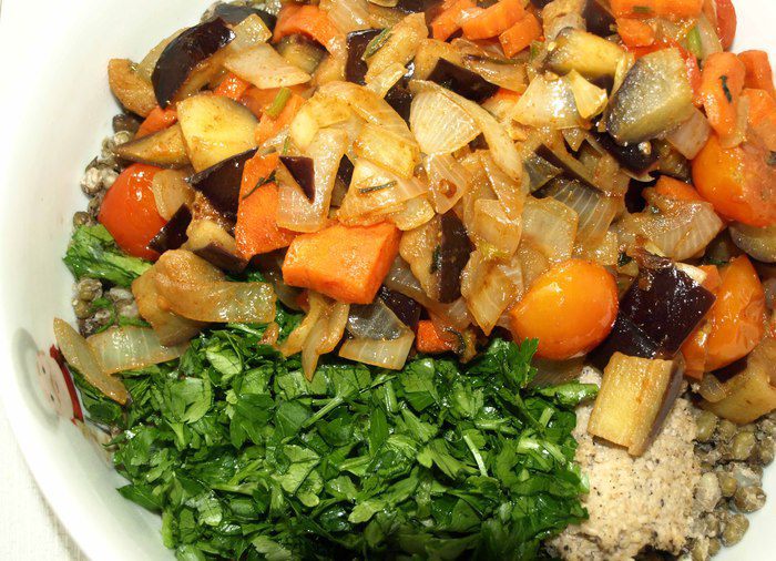 Баклажаны промыть от соли, отжать. Лук, морковь нарезаем произвольно, стебли петрушки порубить. Обжариваем в растительном масле 2-3 минуты. Добавляем баклажаны. Жарим до 3 минуты. Помидоры черри разрезаем пополам и добавляем к остальным овощам. Обжариваем все вместе минуты 2-3. Добавляем соль, перец по вкусу, винный уксус.