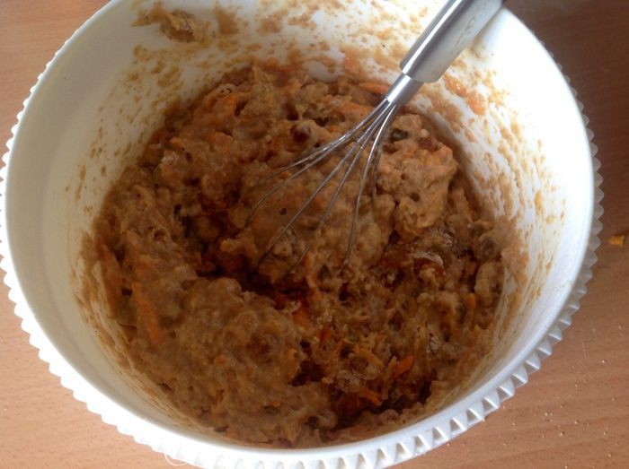 Перемешиваем морковь с мучной смесью и добавляем яблочный сок и сахаром и изюмом. Если смесь суховатой получается, можно еще добавить яблочного сока. Затем добавляем растительное масло, перемешиваем как следует и оставляем тесто на 10 минут. При желании добавляем грецкий орех (предварительно измельчить).
