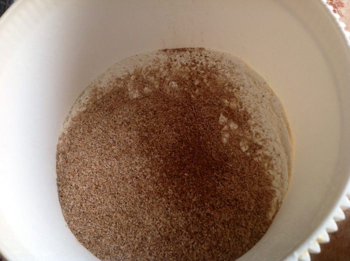 В большую миску просеиваем муку с разрыхлителем, добавляем отруби и корицу, перемешиваем