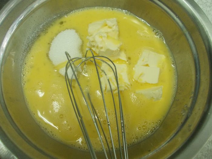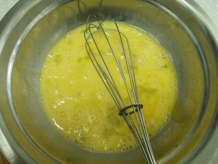 Духовку разогреваем до 200 градусов. Взбиваем в миске яйца.