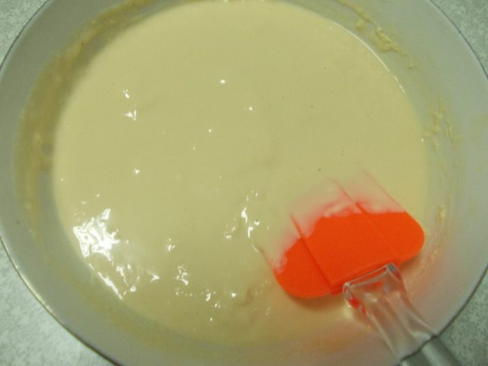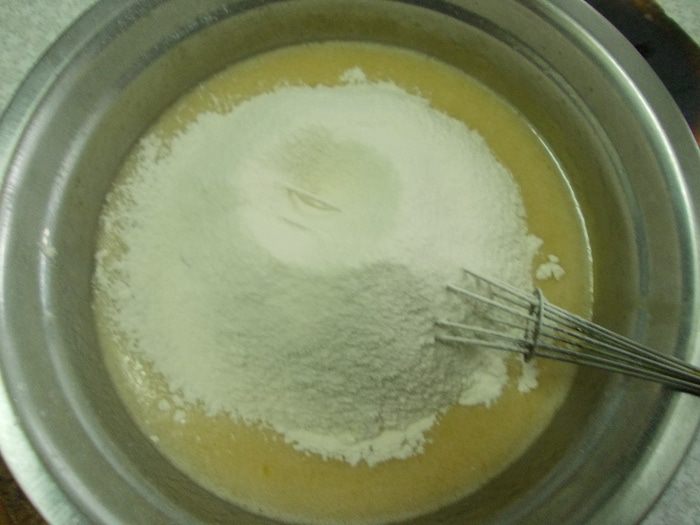 Добавляем просеянную муку и тщательно перемешиваем.