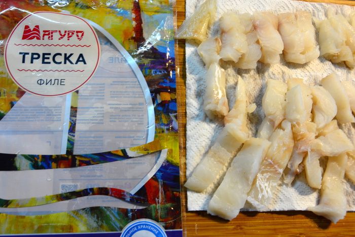 Филе трески помыть и просушить бумажным полотенцем. Нарезать на куски.