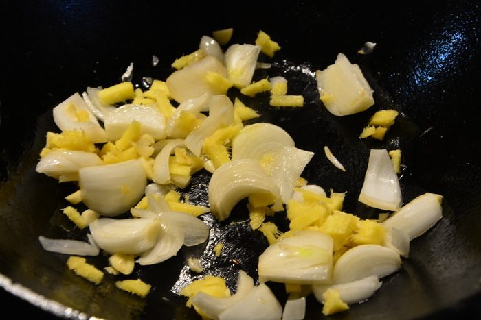 Добавить чеснок и имбирь, перемешать, жарить еще минуту.
