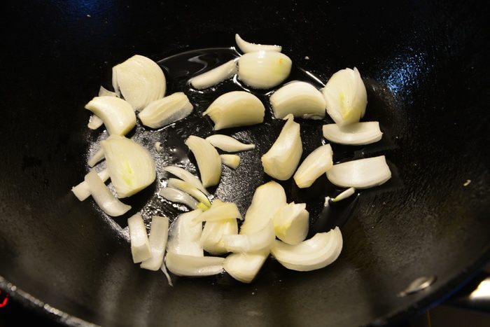 На раскаленной сковороде вок жарить лук на растительном масле (пол минуты).