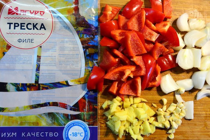 Приготовить овощи: крупно нарезать болгарский перец, белый лук нарезать вдоль, мелко нарезать корень имбиря и чеснок.
