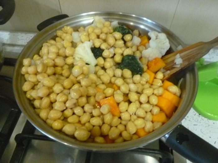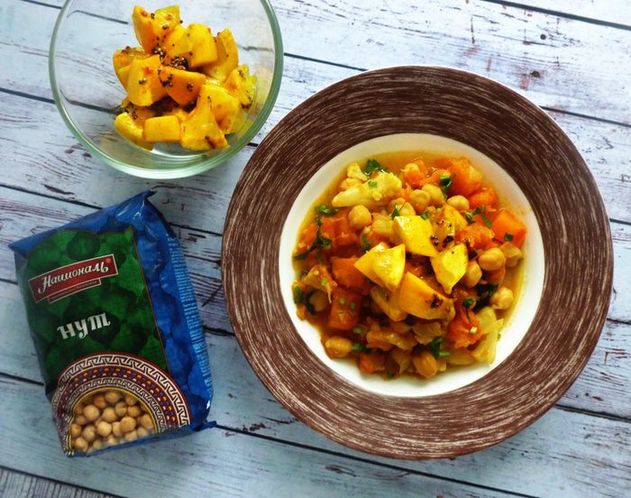 Пряное постное блюдо из тыквы, нута и цветной капусты. Изюминка здесь — острый жареный со специями лимон.