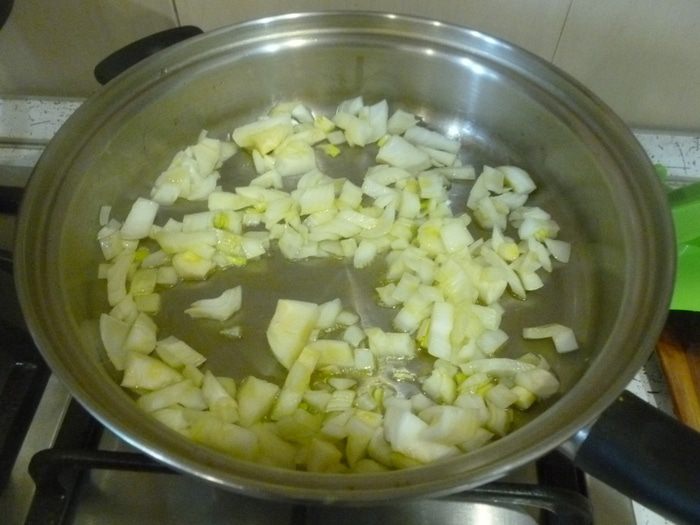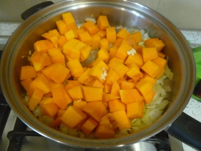 Лук мелко нарезать, тыкву нарезать кубиками. В большом сотейнике разогреть масло, обжарить лук.