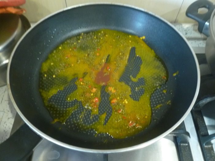 В сковороде разогреть масло, обжарить мелко нарезанный свежий чили, горчицу и куркуму.